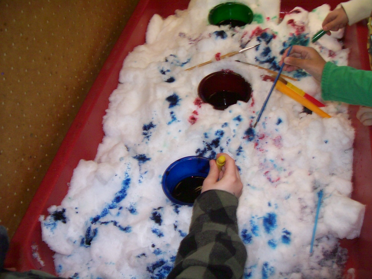 | We had some water color paint left over from spray painting snow last week and wondered what we could do with it. We brought some of the snow in from outside and placed it into the sensory table. We placed large and small paint brushes in the table with the water color paint and waited to see what the children would create. |
